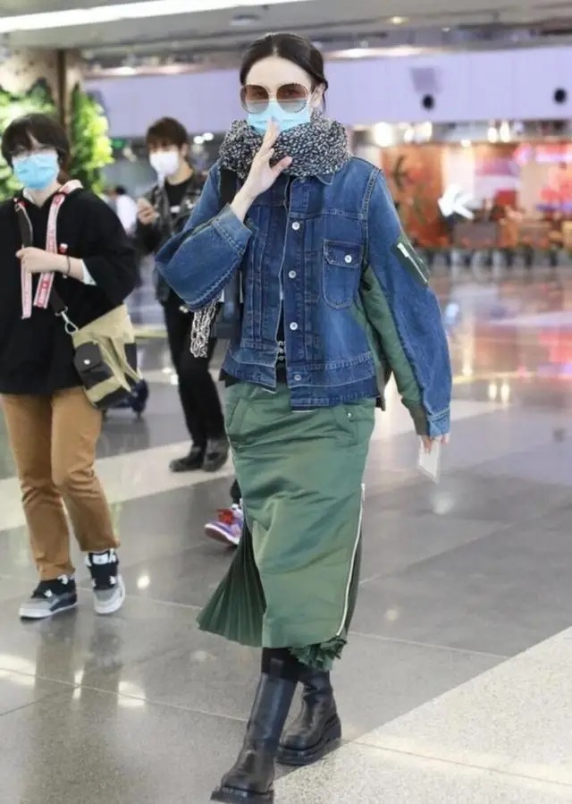 比起同色系搭配,撞色更能彰显品味。蓝色牛仔外套配军绿色连衣裙,色彩碰撞有趣味,再用基础色鞋子、丝巾平衡,不致浮夸。